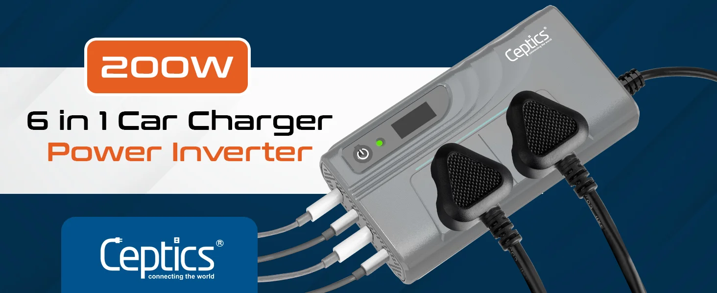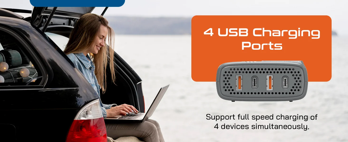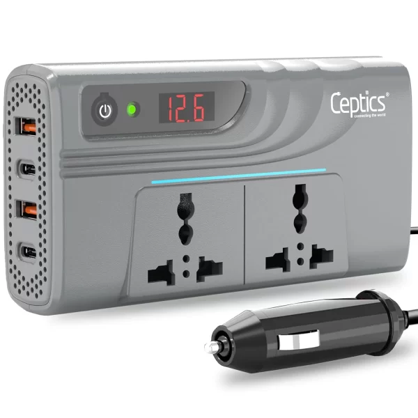 200W car inverter – 2 AC outlets & 2 USB-A & 2 USB-C – Cigarette lighter plug – CE & FCC certified – PI-200M